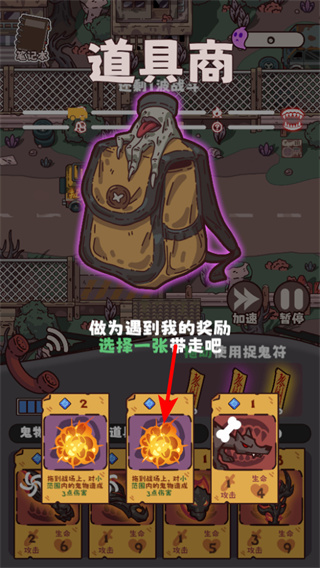 4、遇到道具商时,可选择一张道具卡牌带走,这些道具能在战斗中提供帮助,提升战斗胜率。