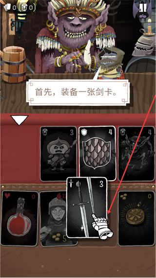 3、根据游戏提示装备一张剑卡,找到界面中的剑卡并拖动到下方手牌装备区,完成该卡牌的装备操作以推进教程。