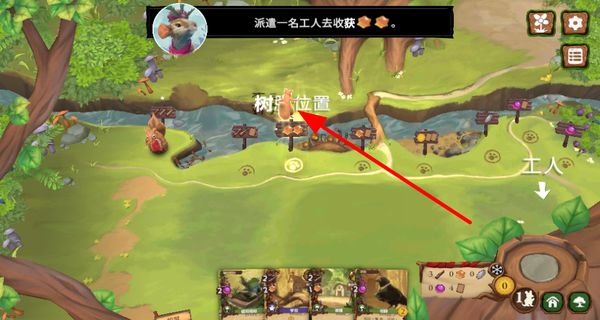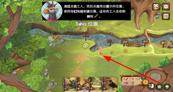 1、点击工人并将其拖动到突出显示的树枝位置,让工人去收割树枝,以此获取资源,助力游戏发展。