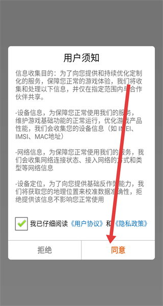 1、在用户须知弹窗中,点击同意按钮,确认接受《用户协议》和《隐私政策》。