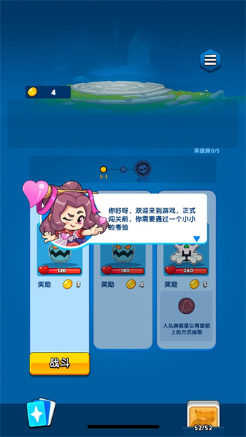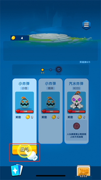 2、然后跟随着小手点击的地方进行点击,进入战斗之中立即开启自己的三国元素卡牌对抗,将所有的怪物都击败;