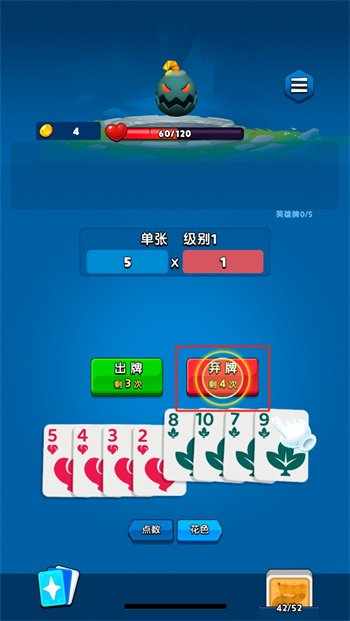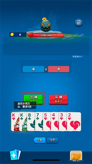 3、上方带来了不同战斗能力的怪物,为你带来危机的战斗挑战,点击选择下方不同的卡牌进行【出牌】操作将上方的怪物都击败;