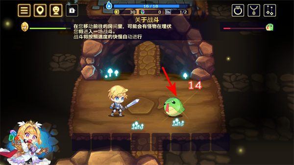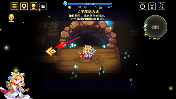 1、通过按方向按键或滑动屏幕来移动角色,按左箭头按键能让角色向左移动,以此探索不同区域,开始冒险进程。