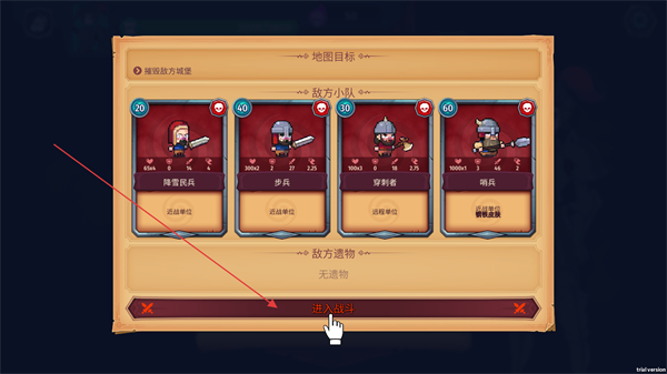 2、查看关卡地图需要完成的目标,以及可以观察敌方小队的属性,点击下方进入战斗按钮开启战斗。
