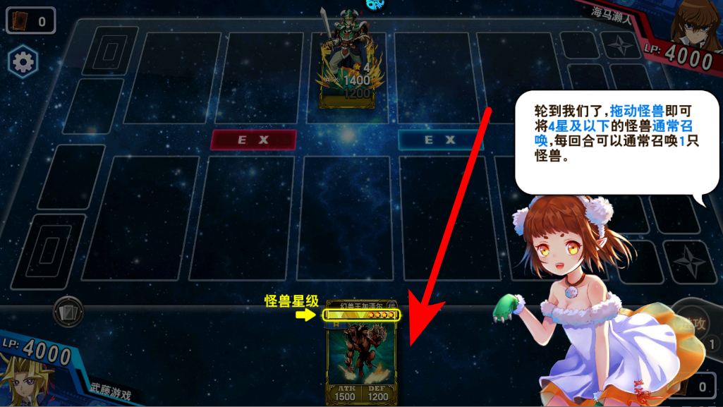 2、轮到自己回合,拖动4星及以下的怪兽进行通常召唤,每回合通常召唤数量为1只,根据手牌中的怪兽卡牌,选择合适召唤到场上,构建己方战力。