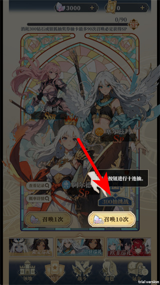 1、进入游戏界面后,点击召唤10次按钮,这是获取角色的关键操作,准确点击才能触发十连召唤流程。