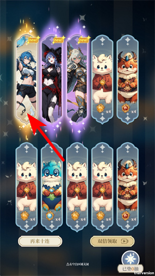 2、在召唤结果界面,查看箭头指引的角色卡片,这是确认获取角色的基础操作,浏览卡片即可了解获得的角色。