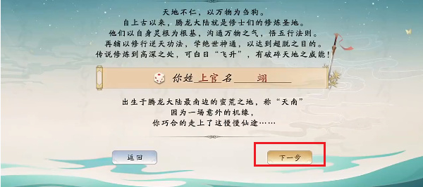 2、进入到游戏的内部之后,玩家还将需要为自己取一个合适的名字,取好名字之后可以点击【下一步】按钮;