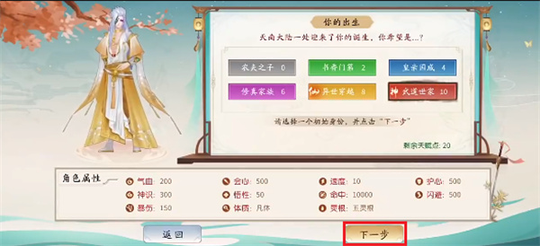 4、随着形象的设计,玩家还将需要进行个人出生情况的选择,可以给自己的出生设置的更加独特一点,设置好之后,继续点击【下一步】按钮;