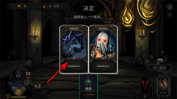 2、击败敌人后点击下一房间可进入新场景,进入前可留意场景的布局和可能出现的敌人,为后续战斗做好准备。