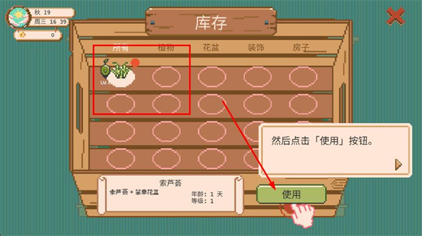2、打开库存界面,选中已解锁的植物,点击使用,将其加入培育队列。