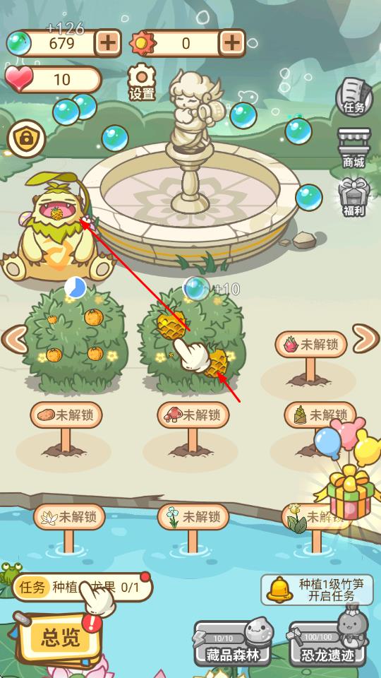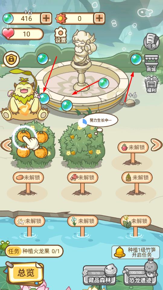 2、植物生长过程中,会产生水精华等资源,可点击收集,同时场景中的喷泉等区域也会生成资源,助力后续种植。