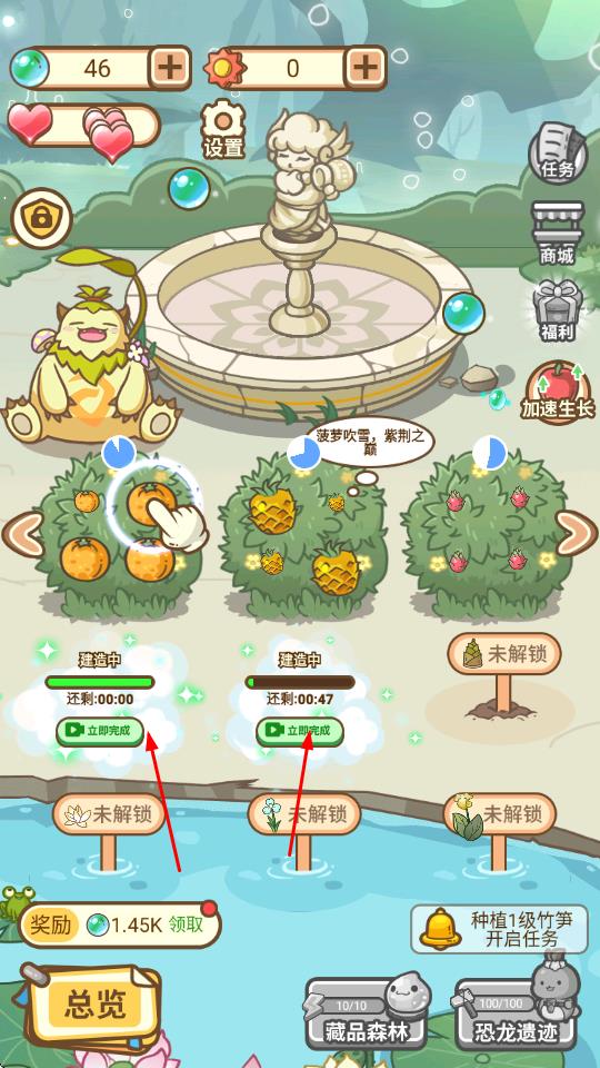 4、对于建造中的植物,可选择立即完成来加快进程,还能使用加速生长功能,提升植物生长效率,快速推进游戏进程。