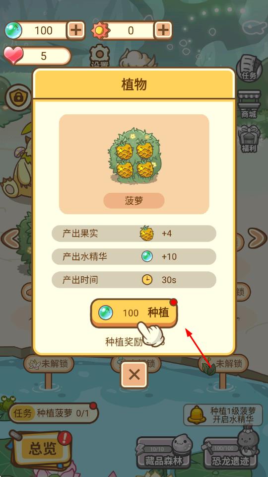 1、进入游戏后,花费水精华种植菠萝等植物,如消耗100水精华种植菠萝,等待30秒即可产出果实与水精华。
