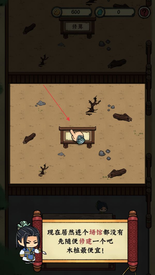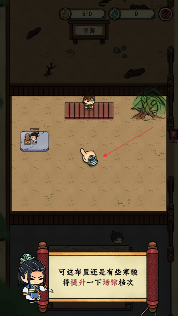 4、木人桩馆修建好后,发现武馆布置依旧有些寒酸,按照提示点击武馆内的空白区域,准备进行场馆档次的提升,让武馆看起来更完善。