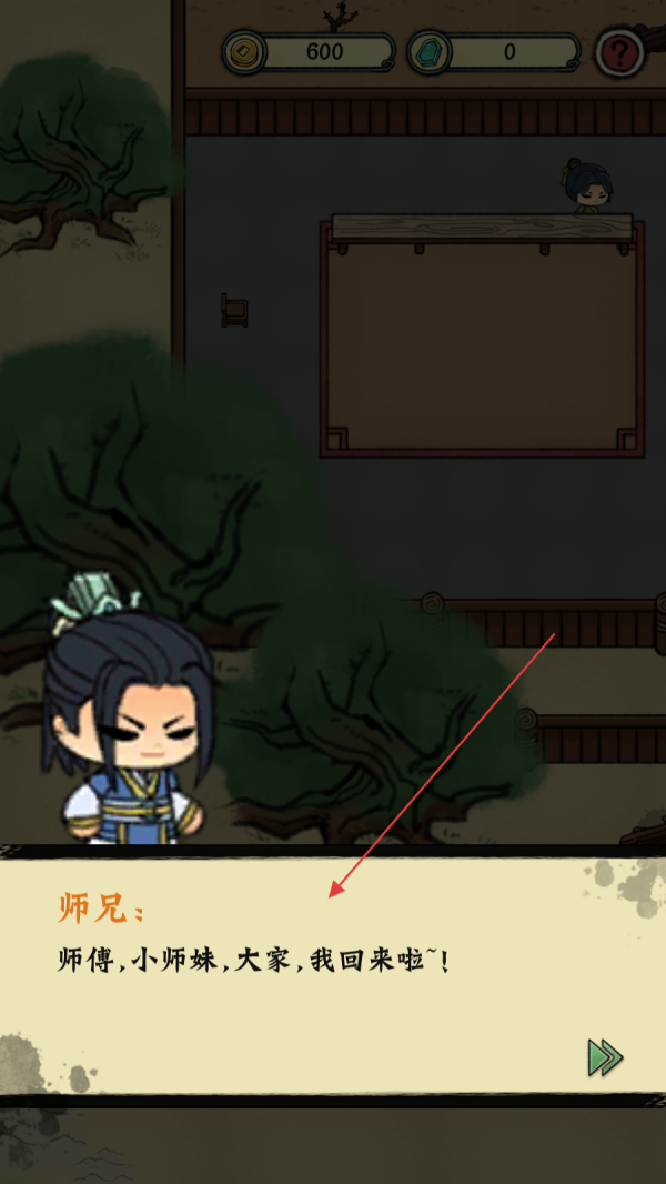 1、进入游戏,看到师兄“师傅,小师妹,大家,我回来啦”的对话后,点击屏幕完成对话推进剧情。