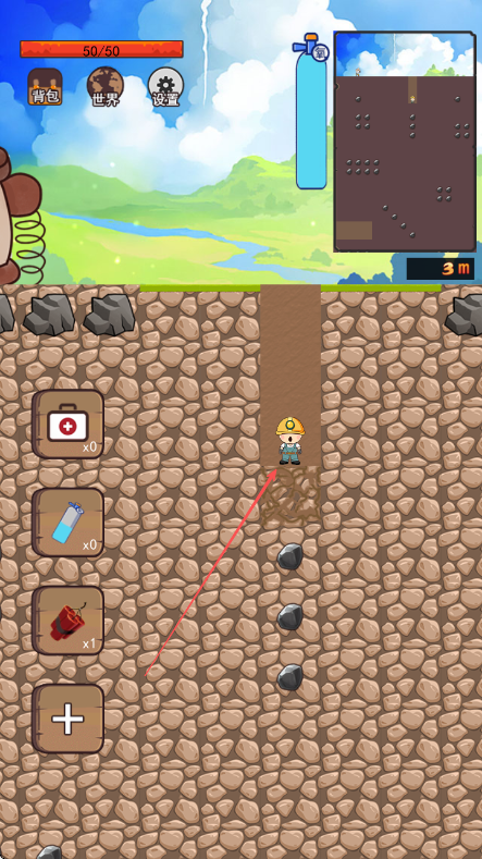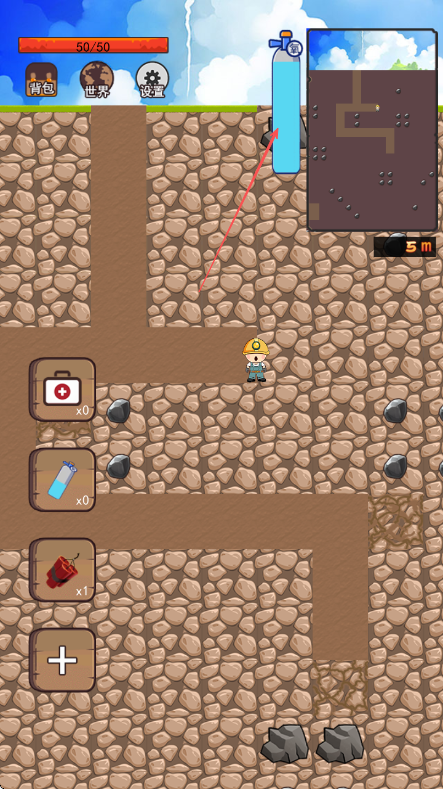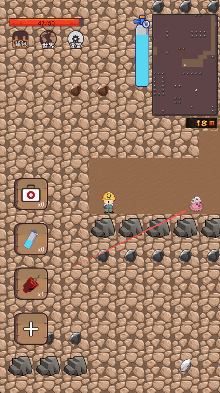 1、进入游戏界面查看上方生命值条和氧气瓶及右侧小地图了解地下情况操控角色开始向下挖掘。