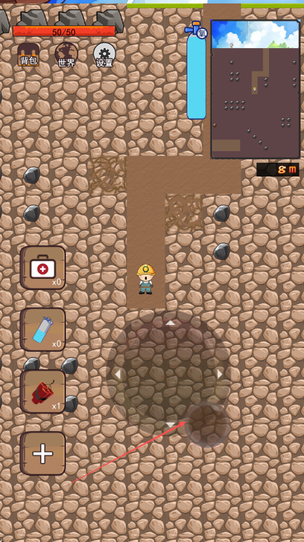 2、利用屏幕下方虚拟摇杆控制挖地小子移动方向持续挖掘并注意周围可收集的矿石。