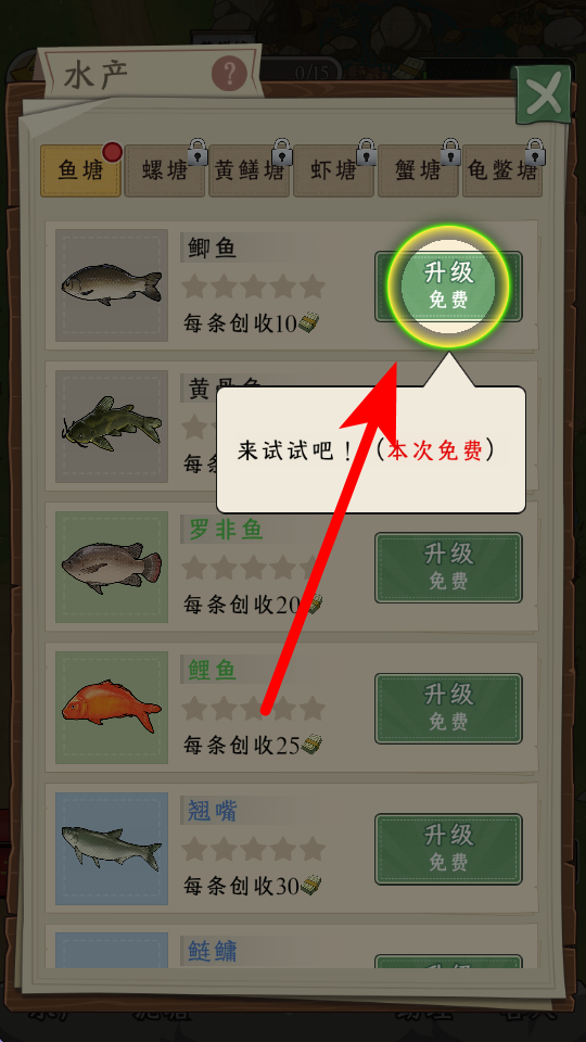 1、在水产板块,能对鱼塘里的各类鱼进行升级,像鲫鱼等。