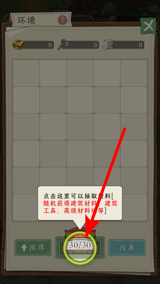 2、环境板块可抽取材料,点击抽取区域,能随机获得建筑材料、建筑工具、高级材料等。