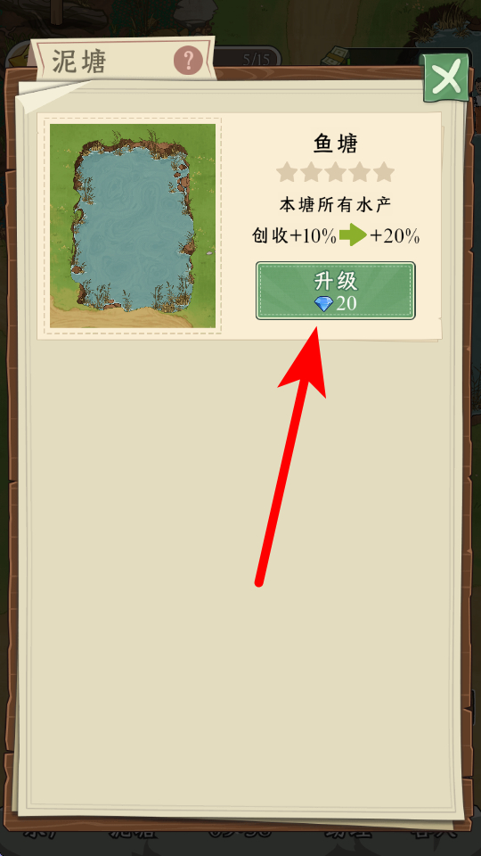 3、泥塘里的鱼塘也能升级,升级需要消耗一定数量的钻石。