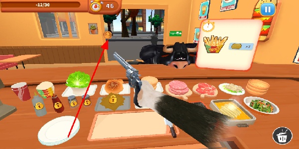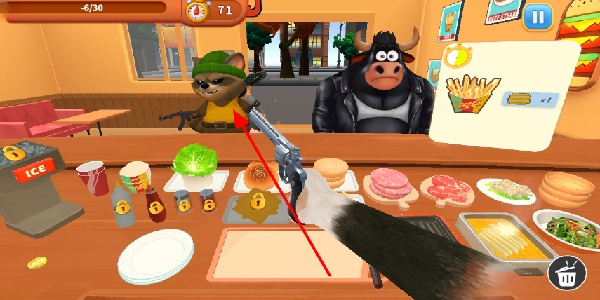 2、拿起手枪击毙抢劫犯,应对餐厅中的突发状况,保护餐厅安全,继续经营餐厅,提升游戏体验。