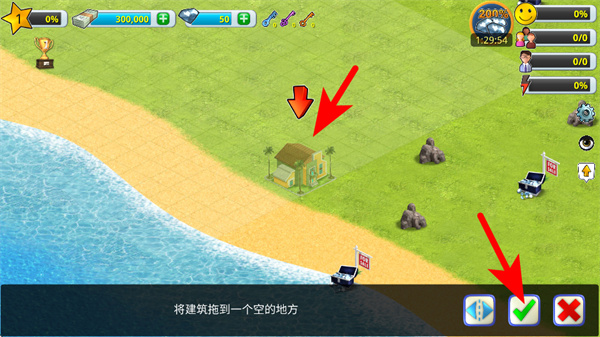 3、将选定的建筑拖动至海滩的空地区域,这是确定建筑位置的核心操作,放置后可完成建筑的选址,推进建筑的建造进度,完善区域布局。