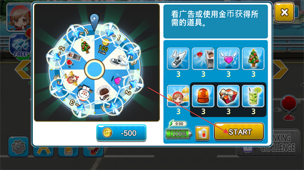 1、在转盘界面可消耗金币或看广告获取道具,点击START启动转盘抽奖。