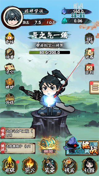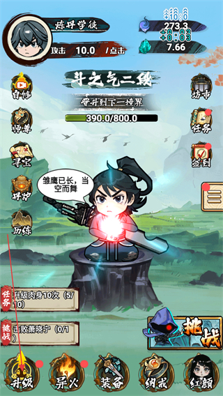 2、在游戏主界面,点击角色形象可获取斗气,推进斗之气一段向更高境界提升,同时可通过侧边功能栏使用任务等功能。