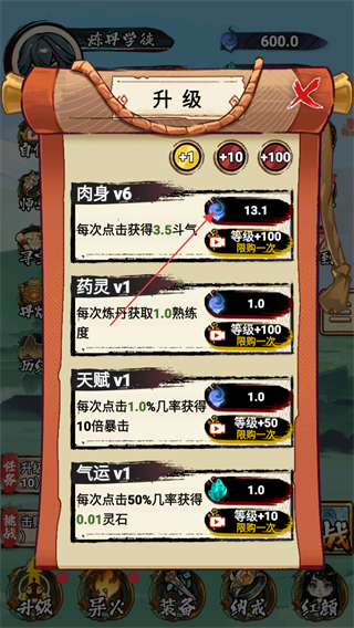 4、进入升级界面后,选择如肉身v6的升级项,消耗对应资源升级,可提升每次点击获得的斗气数量以增强角色。