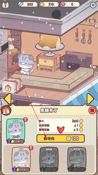 4、点击猫咪可以查看猫咪的具体工作信息,花费金币开启猫咪自动化制作甜品。