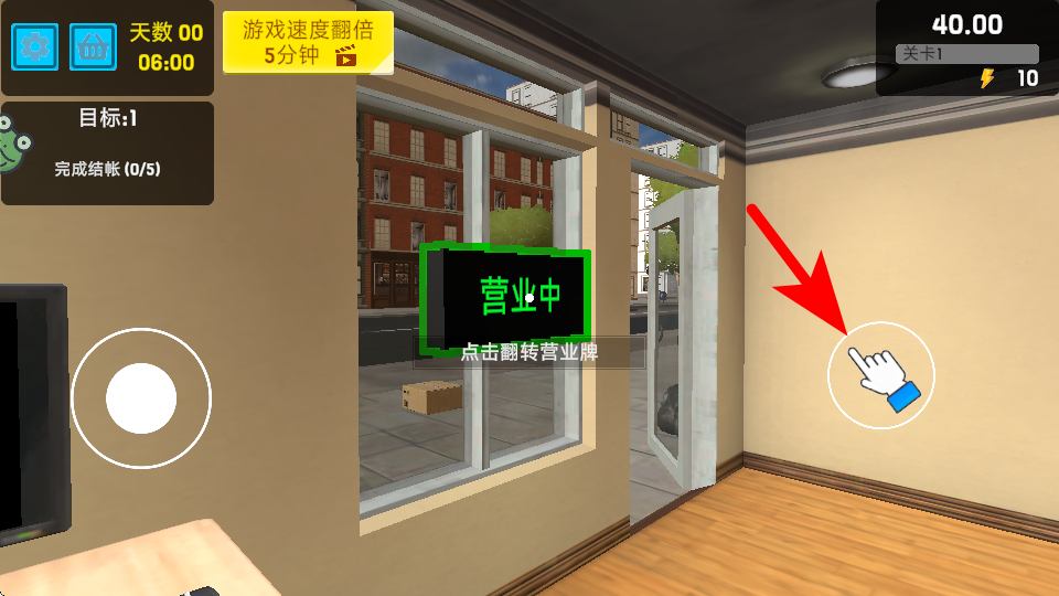 1、点击翻转营业牌,这是开启店铺营业的关键操作,操作后可切换店铺状态为营业中,吸引顾客进店消费,推进经营流程。