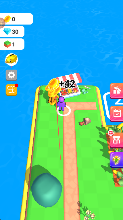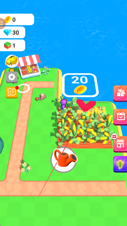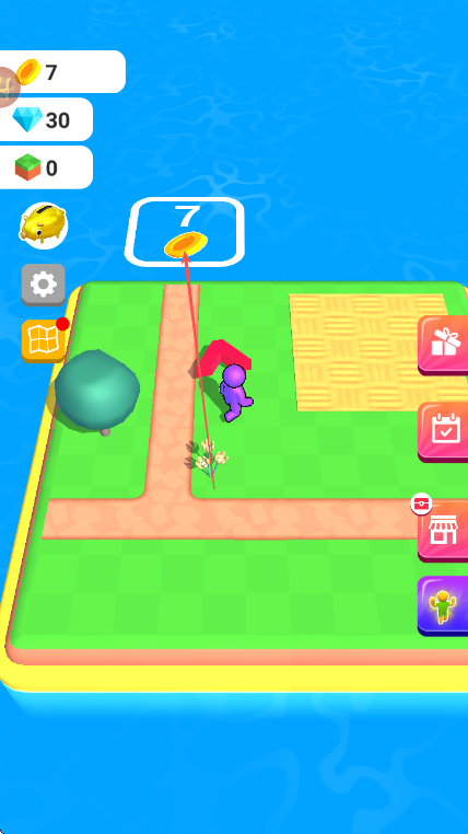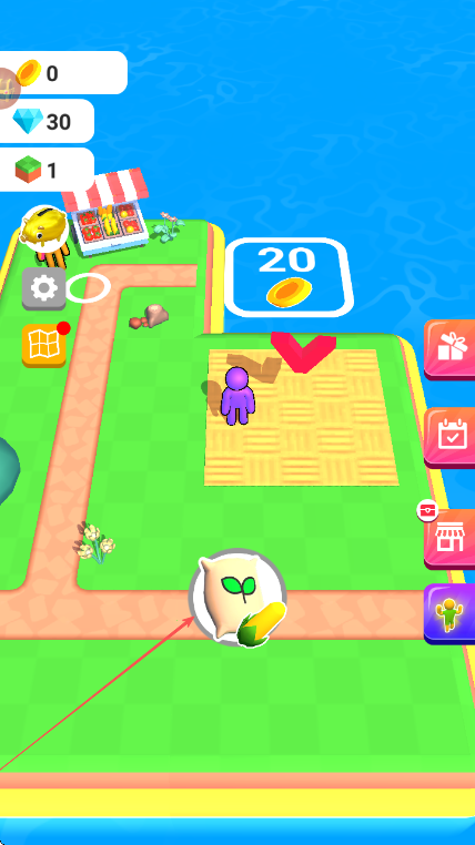 1、操控紫色小人在农场中移动,看到道路上的金币,靠近进行收集。