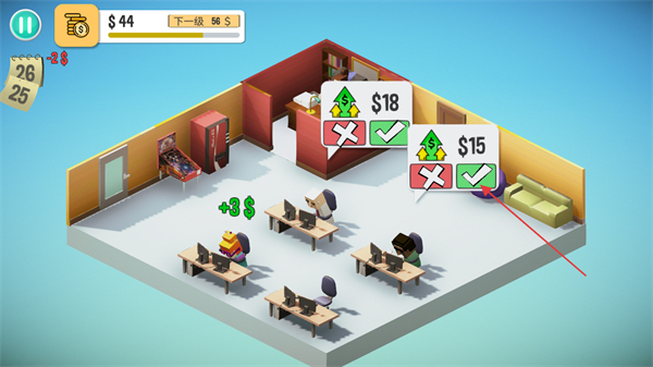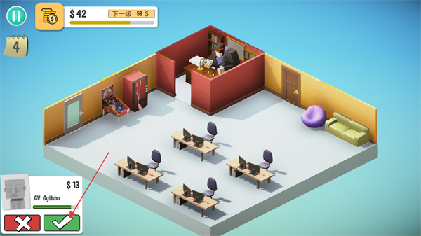 2、进入办公室场景后,查看员工信息,通过左下角的对勾或叉按钮,处理员工的相关请求来进行员工管理。