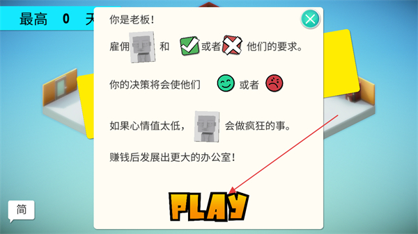 1、查看办公室模拟器的规则说明,需雇佣员工并处理其要求,留意员工心情值,点击界面的PLAY按钮进入游戏。