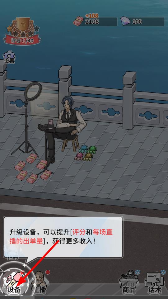 4、点击设备按钮,可升级直播设备,提升了评分和每场直播的出单量,增加了收益。