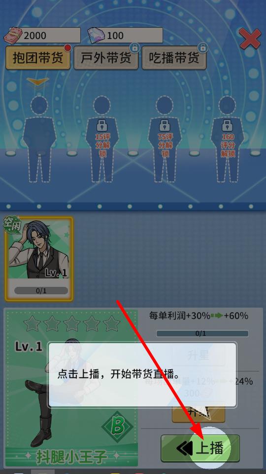 3、点击上播按钮,可让主播开始带货直播,获取收益和评分,推进了游戏的进程。