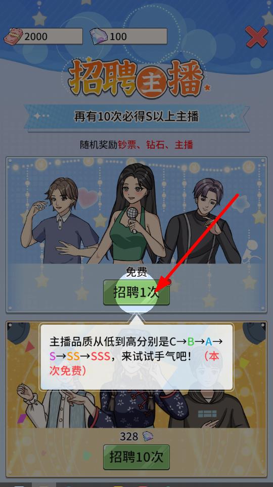 2、招聘界面点击招聘1次按钮,免费招募一次主播,有机会获得高品质主播,提升实力。