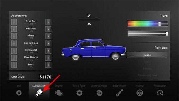 2、点击Appearance选项定制汽车外观,外观定制是塑造汽车风格的核心步骤,定制后可调整车头、车尾、轮毂等部件,打造车型。