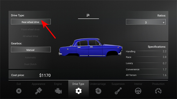 3、选择Rear wheel drive驱动类型,类型选择是优化汽车性能的关键环节,选择后可影响汽车的操控、速度等属性,适配需求。