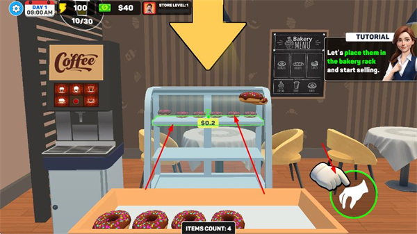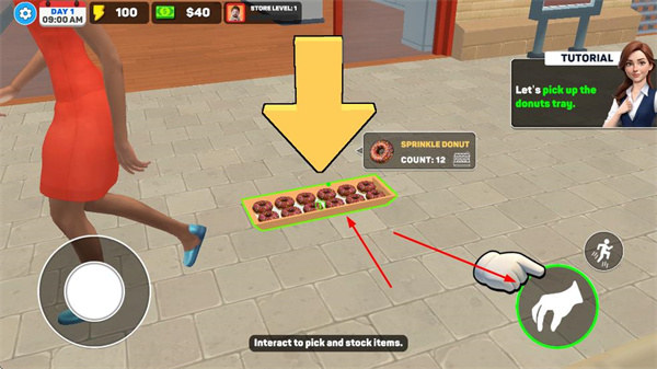 1、拾取甜甜圈托盘,收集商品,为店铺经营准备货源,开启经营之旅。