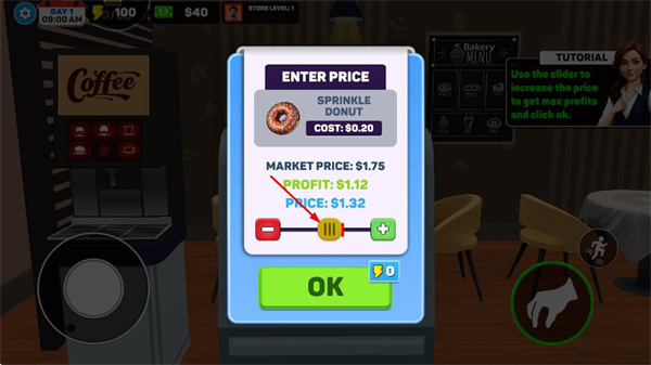 3、调整甜甜圈价格,利用滑块设置合理售价以获取最大利润,点击OK确认。