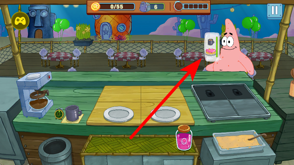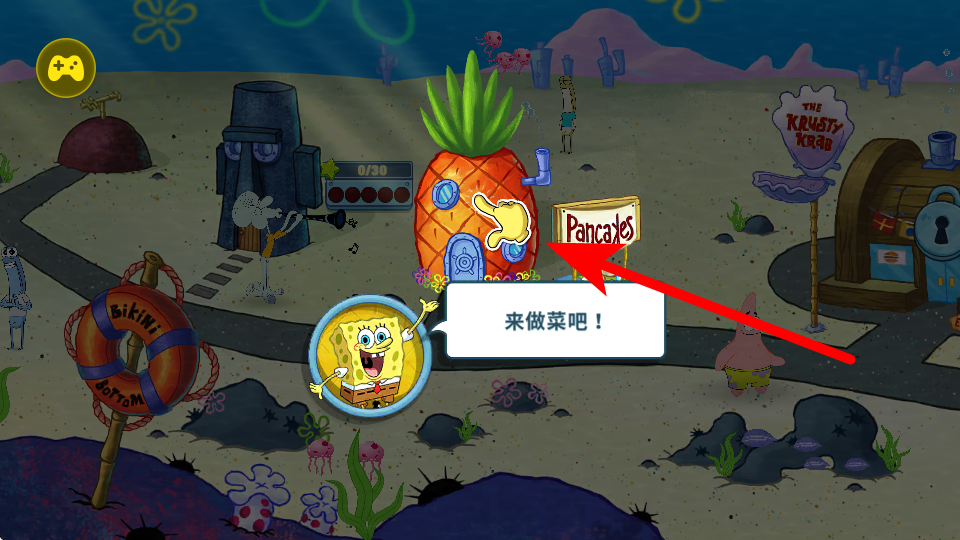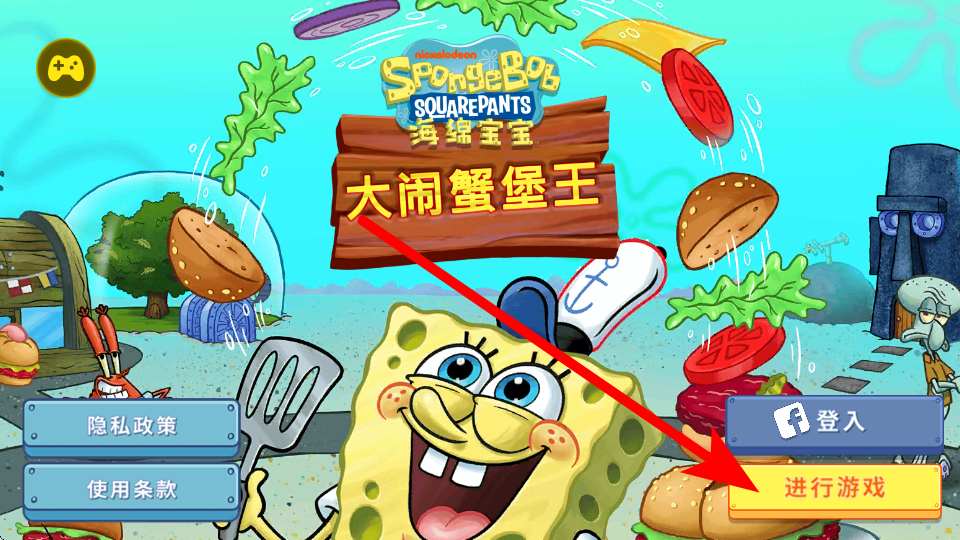 1、进入游戏后,点击进行游戏按钮,即可进入蟹堡王场景,开启经营之旅,准备迎接顾客并为其做菜。