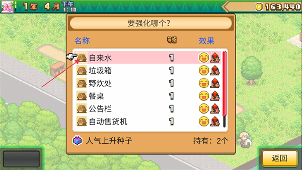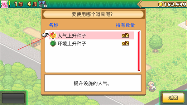 2、点击道具,在道具菜单中选择提升人气的种子或是环境上升的种子进行使用。