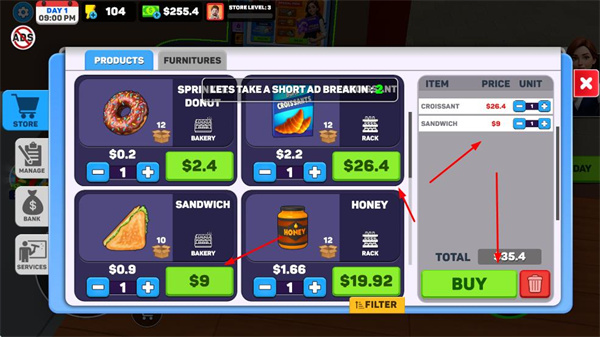1、在商店界面选择甜甜圈、三明治等商品,点击购买补充货源,为店铺经营准备多样商品。