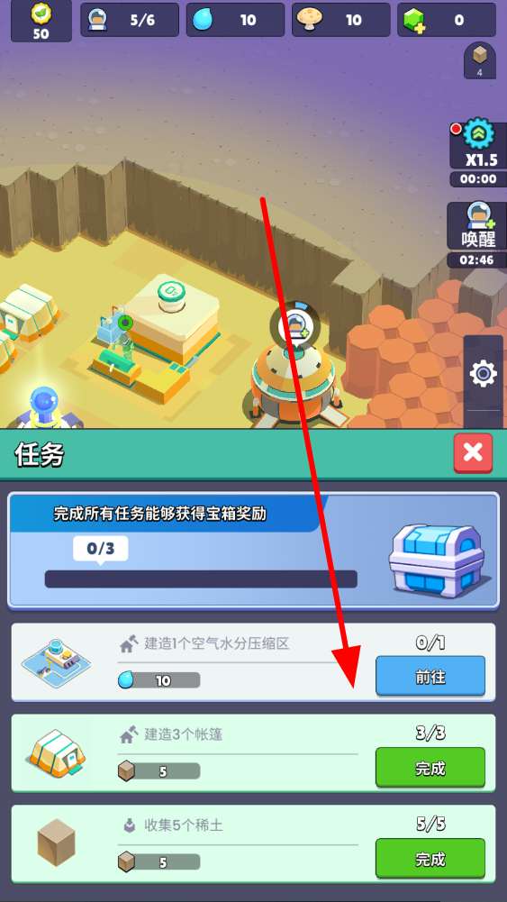 4、特定建筑、收集资源等,查看任务列表,根据任务要求前往相应地点进行操作,完成任务后可获取宝箱等奖励,助力火星基地进一步发展。