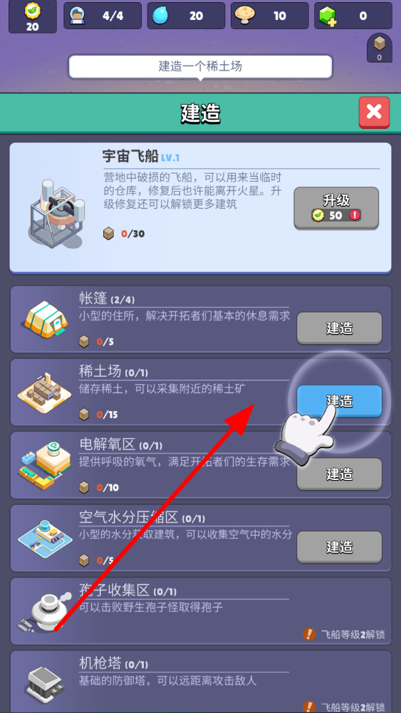 2、进入建造界面,里面有宇宙飞船、帐篷、稀土场等多种建筑选项,根据需求点击建筑旁的建造按钮,消耗相应材料即可开始建造。