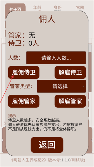 4、输入人数后即可点击雇佣侍卫或雇佣管家,雇佣管家时记得选择管家类型。