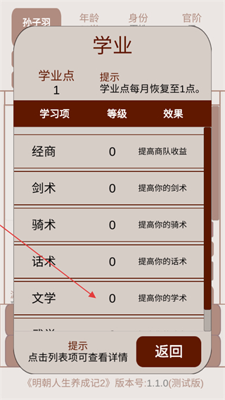 1、游戏中点击下方的学业按键,可以进行学业点的分配,每个月会恢复1点。