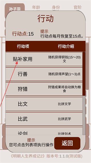 2、每个月都有15点行动点数,可以选择行动项进行获取属性值。